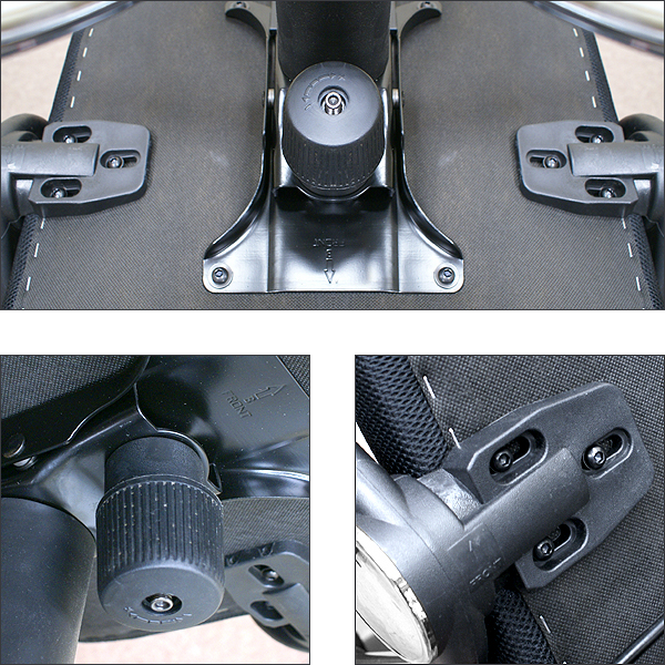 | ロッキングの硬さは座面下にあるスプリング一体型ネジで調節できます。 | アームレストの間隔を移動したりまた、外して使用する事も可能です。 |