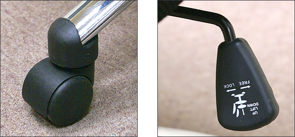 | 安定感のあるスチールメッキの5本脚に樹脂性のキャスター | 操作レバーにより座面の高さとロッキングの解放/固定ができます。 |